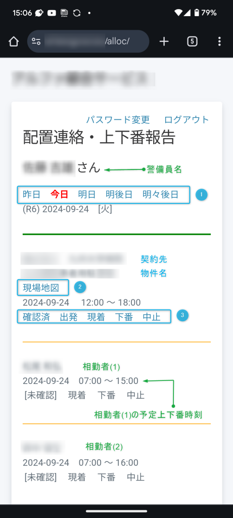 - ❸ 確認済・出発・現着・下番・中止 のリンクは、タップすれば、その情報が警備業管理システムに行き、当該配置情報の状態が遷移します。(詳細は後述)