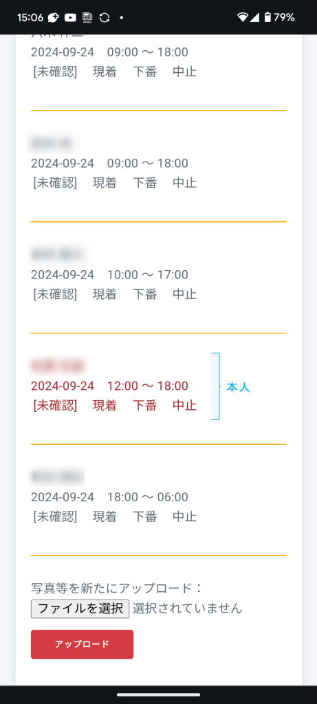 - その下は、相勤者の名前と予定勤務時刻が一人ひとりオレンジのラインで区切られて表示されます(本人も表示される)。これにより、まだ来ていない相勤者がいるかどうかが本人にも分かるようになります。
