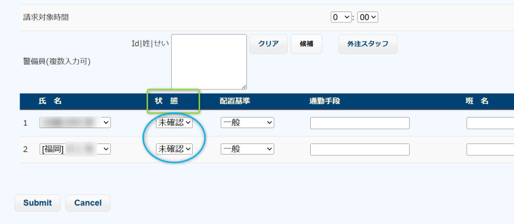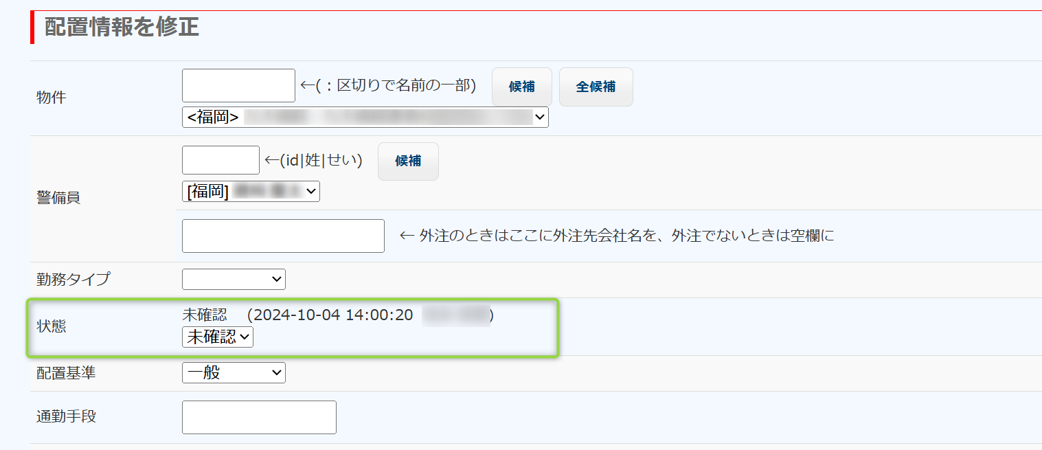 警備業管理システムで配置の新規入力を行うと、意図的に変更しない限り、その勤務は「未確認」の状態になります。