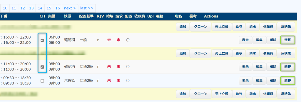 下図のように、チェックボックスにチェックを入れ(複数可)、遷移ボタンをクリックすると、チェックされた勤務の「状態」を遷移させることができます。