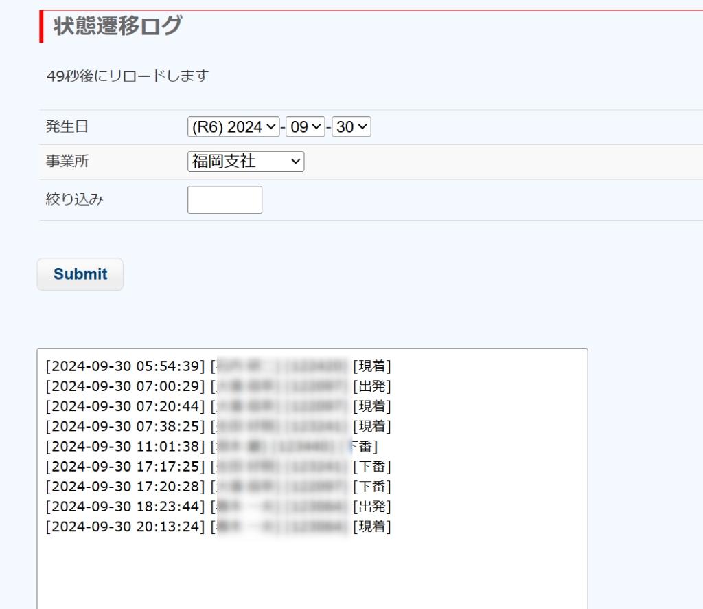 日付と営業所を選択してSubmitすると、状態遷移を行ったログが表示されます。