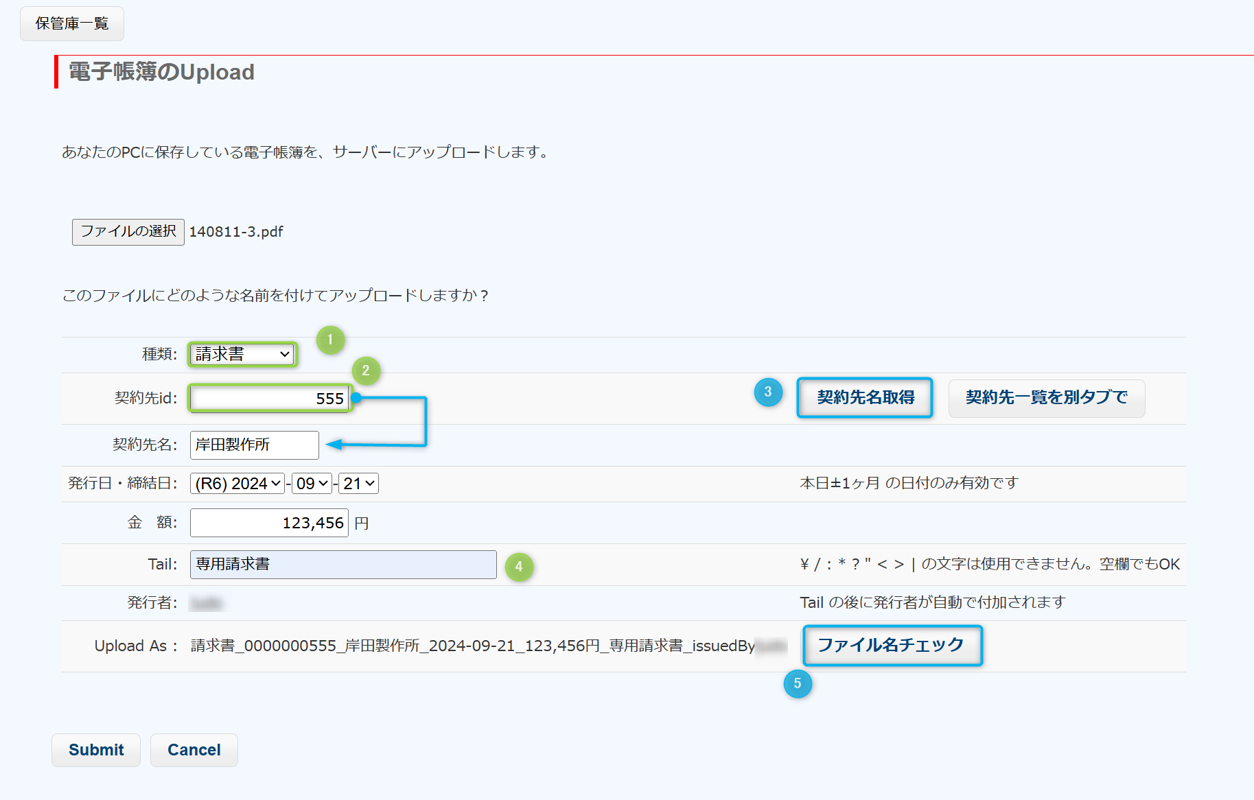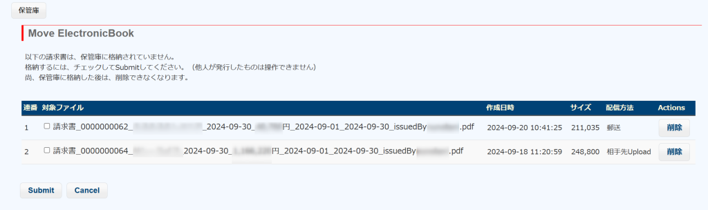 本システムで作成した請求書を保管庫に格納するには、上記のアップロードを使う必要はありません。当該請求書は、サーバーにも一定期間保管されていますので、ファイル移動によって、保管庫に格納するようになっています。