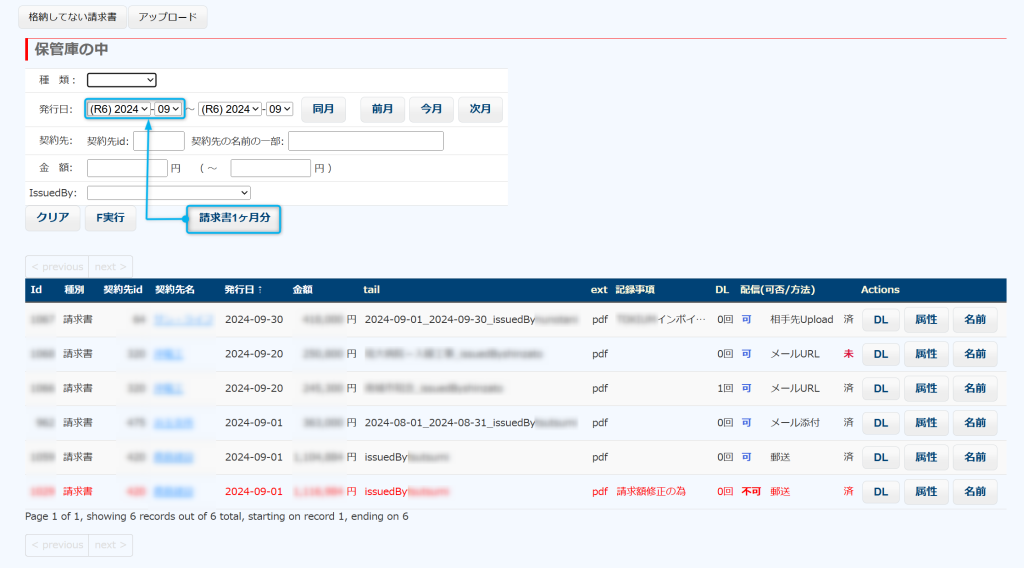 保管庫一覧は、電帳法に則り、発行日・相手先の名前・金額などをキーにして検索できるようにしています。
