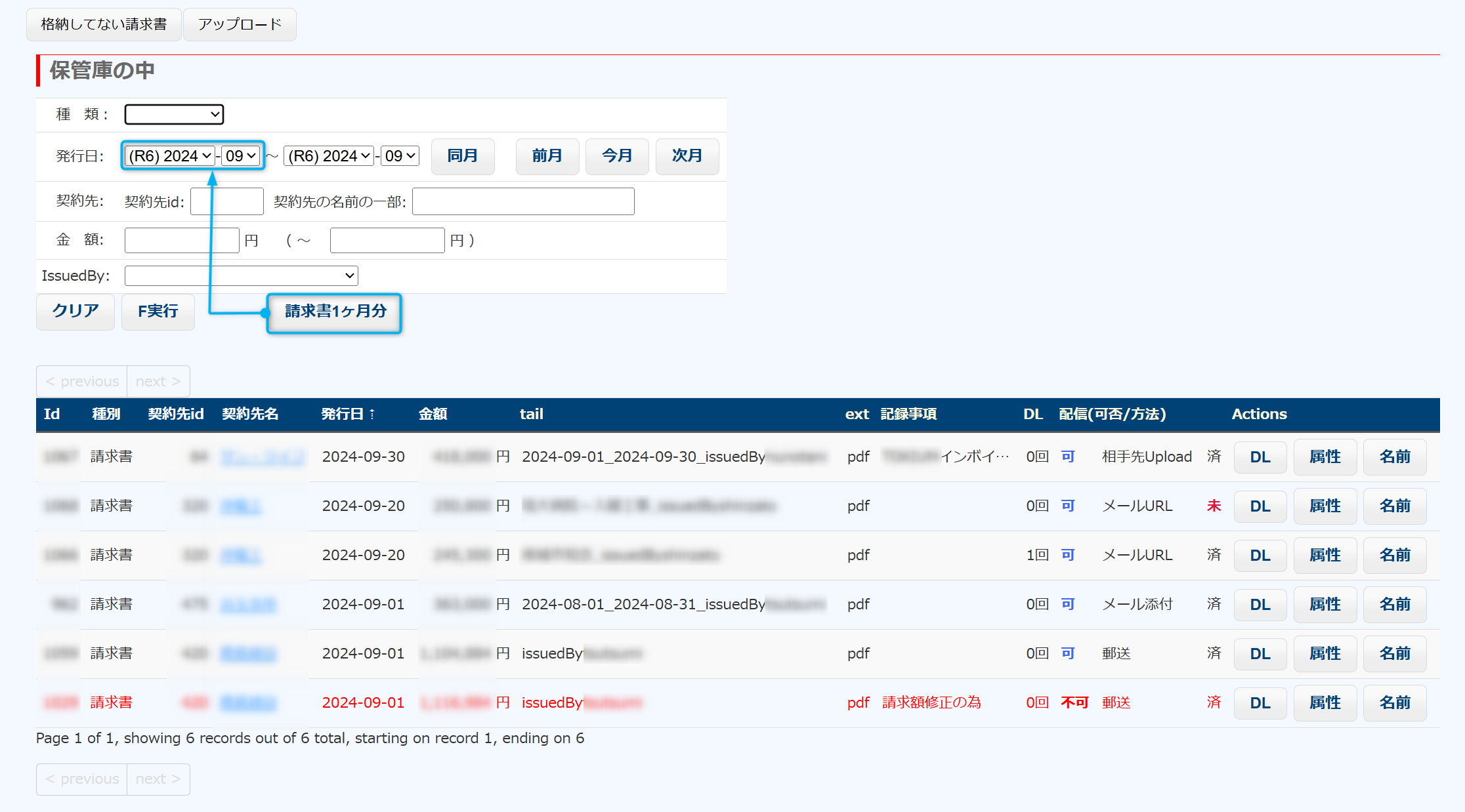 [グローバルナビ:メニュー] > 電帳法(アウトバウンド) > 保管庫一覧・検索