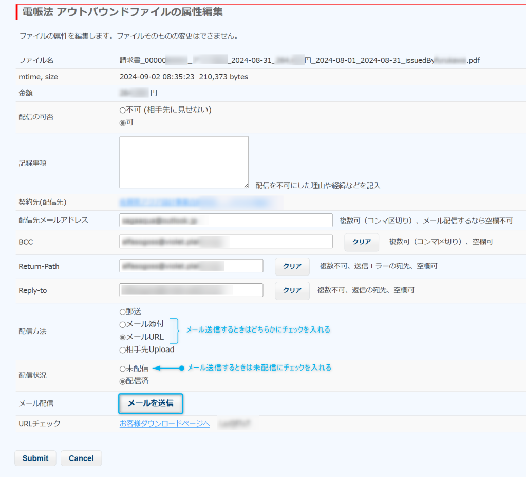 | 配信状態 | 郵送の場合、郵送が終わったら手入力で配信済にしてからSubmitしてください。 相手先Upload なら、Upload作業が終了してから配信済にしてSubmitします。 メール添付とメールURLの場合は、未配信にしてから、メールを送信ボタンをクリックします。メールが送信されると同時に配信済に切り替わってSubmitされます。 |
