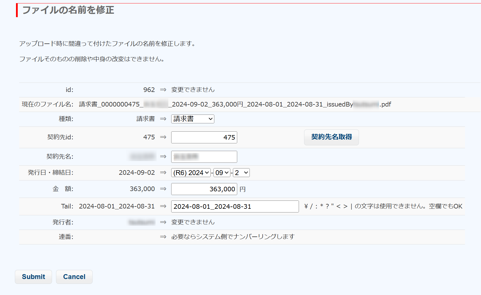 - ファイル名の変更が可能なのは、発行日から2ヶ月以内です。それを過ぎるとファイル名の変更はできません。