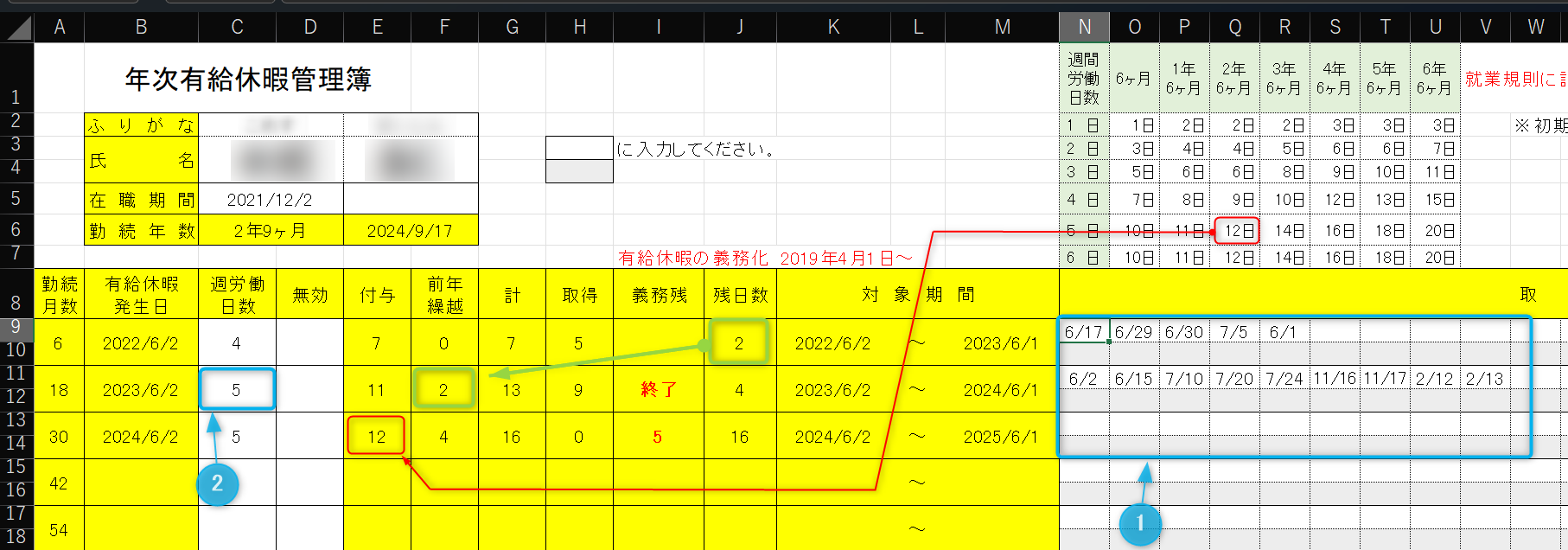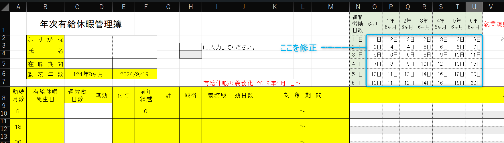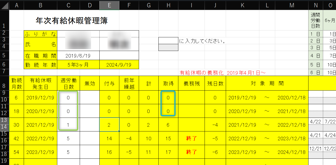 有給休暇の管理簿(エクセルブック)の仕様