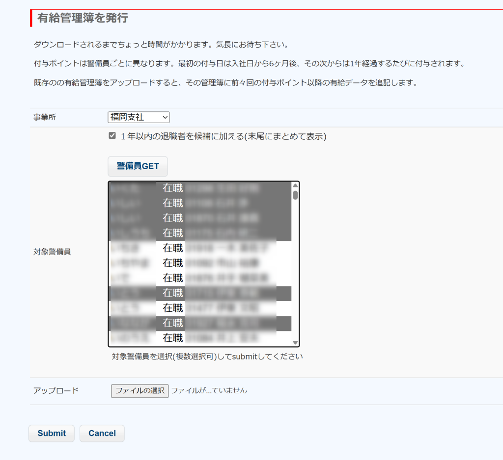 - 事業所を指定して、警備員GETをクリック。有給管理簿を作成する警備員の候補が表示されますので、(複数)選択してSubmitします。