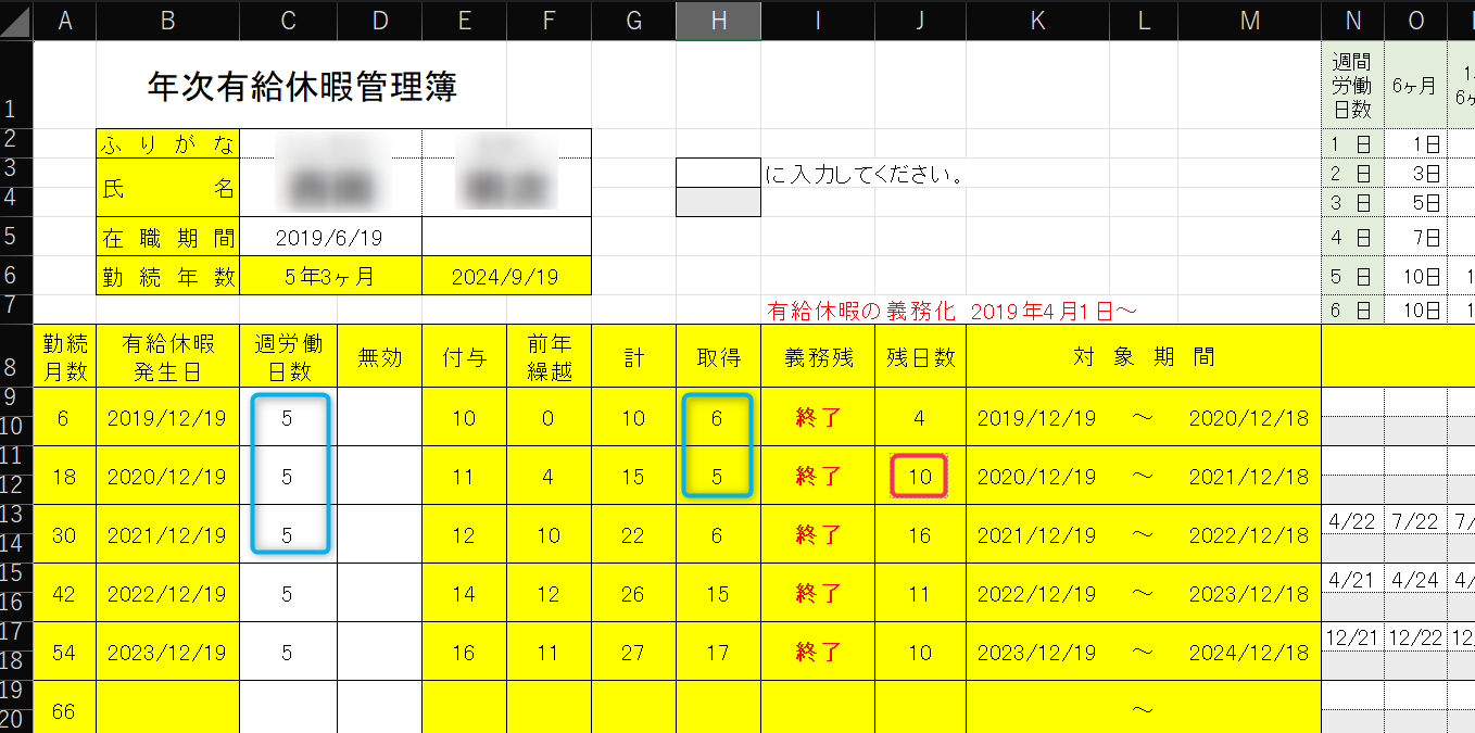 取得のところは数式が入っていますが、気にせず実績に応じて数値を手入力します。取得状況がわからない場合は、図の残日数のところ(赤枠)を手入力してください。
