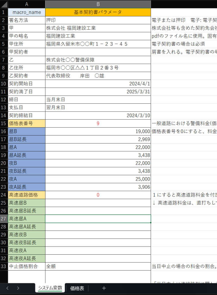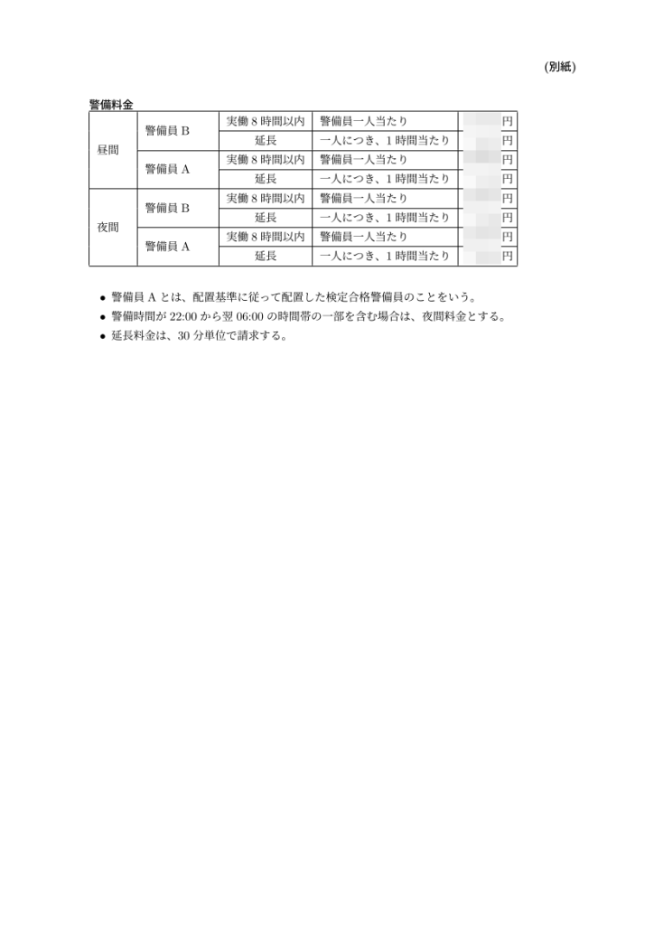 - 警備料金は、基本契約書の最終ページに別紙として出力されます。価格表番号 = 0 にすると、警備料金のページを出力しません。御社独自の料金表をエクセル等で作成してPDF出力し、ここで作成した基本契約書と結合することができます。