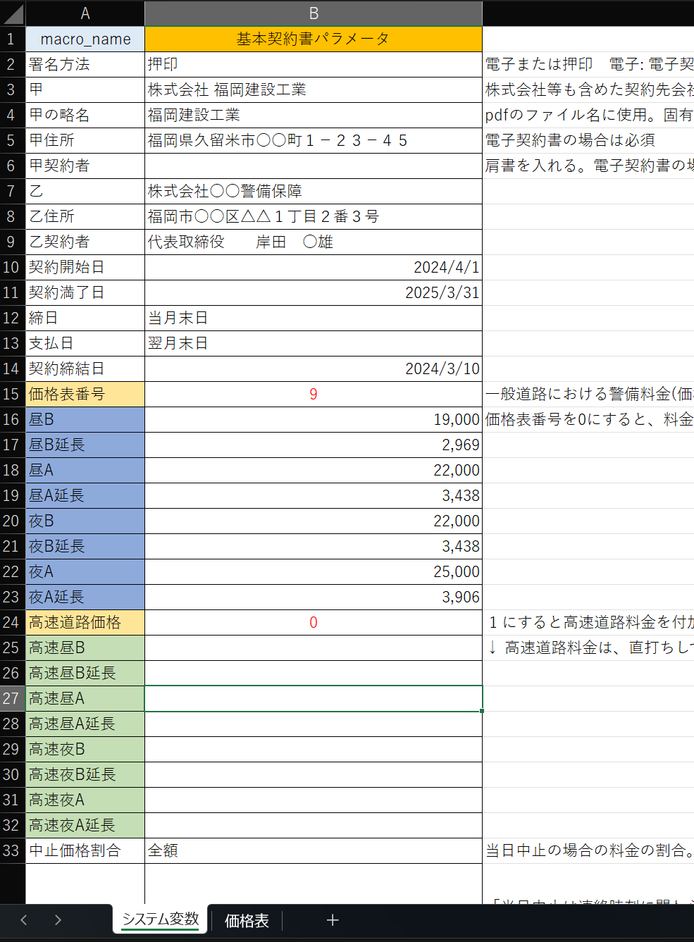 契約先の情報をDBに登録する方法、及び警備料金の設定、2号業務の基本契約書作成について解説します。