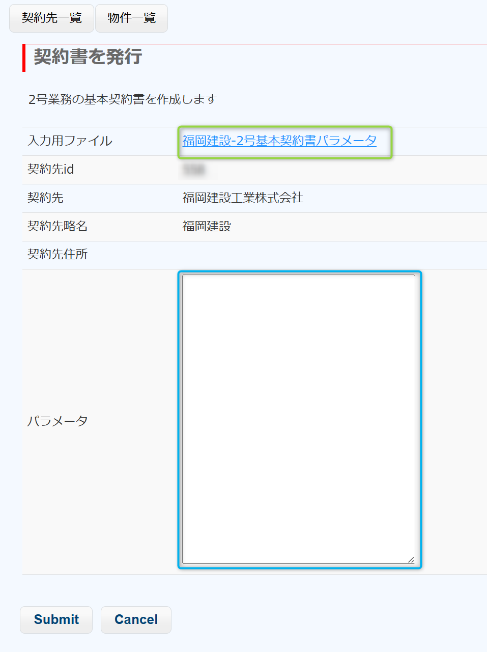 グローバルナビ:受注物件 > 契約先一覧 > 表示(契約先View)> 2号基本契約を作成