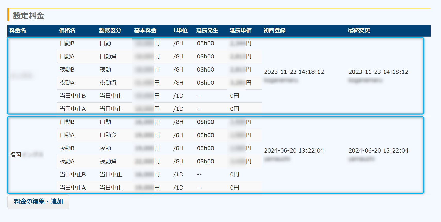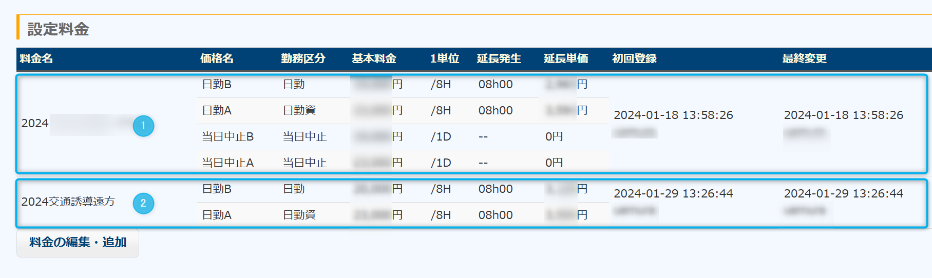 そこで、資格者の昼は〇〇円、夜は△△円、というように条件によってそれぞれの価格を決めて、それらの価格を一まとまりにしたものを当システムでは料金と呼んでいます。