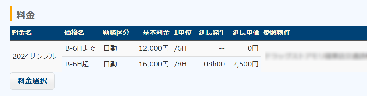 | 延長単価 | 延長料金の時間単価(1時間当たりの金額)。延長発生時間が設定されていないときは設定しても無視される。 |