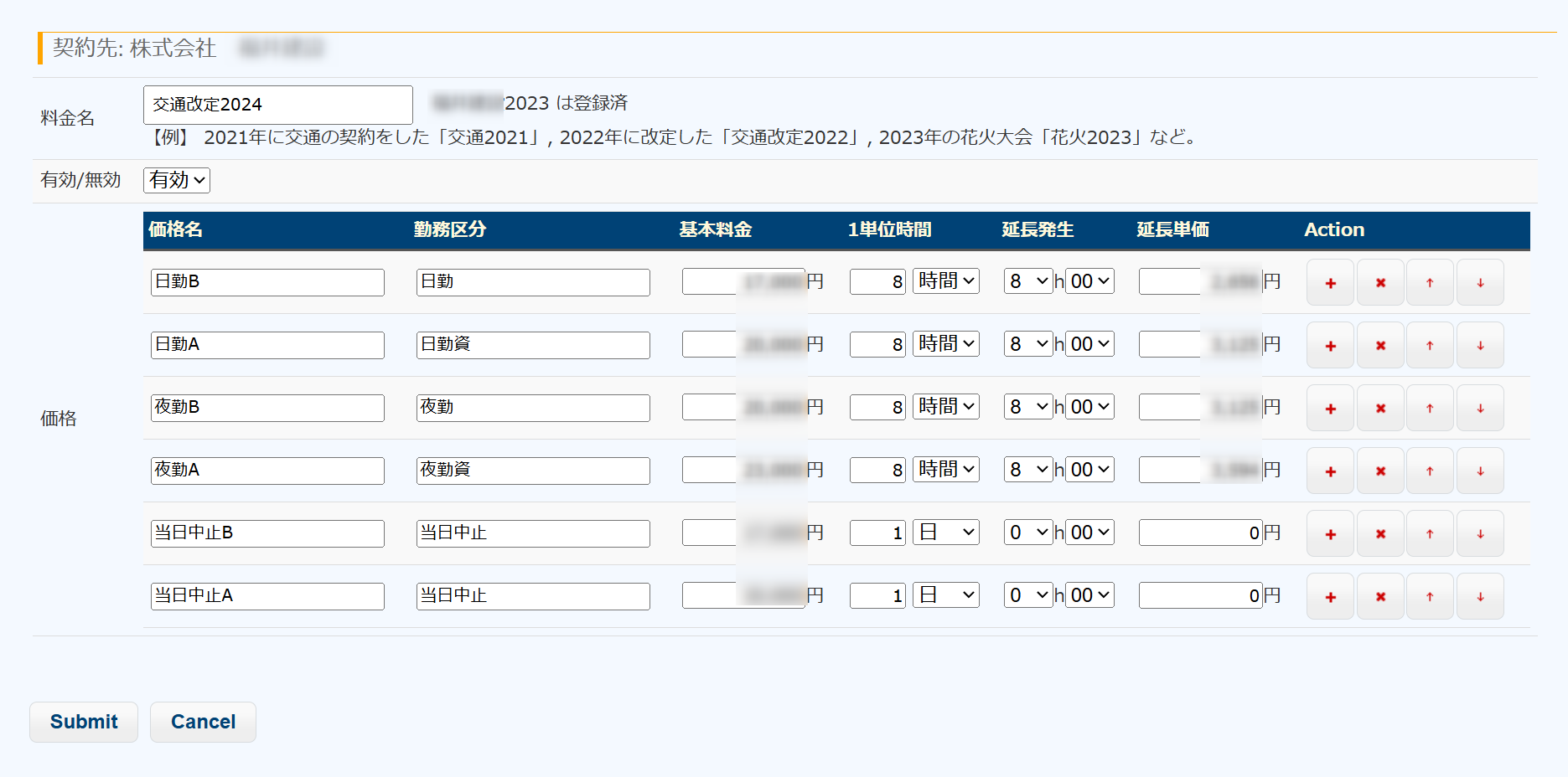 一つの契約先に対して、「○○施設の料金」「駐車場警備の料金」「△△花火大会の料金」など複数の料金体系を登録することができます。