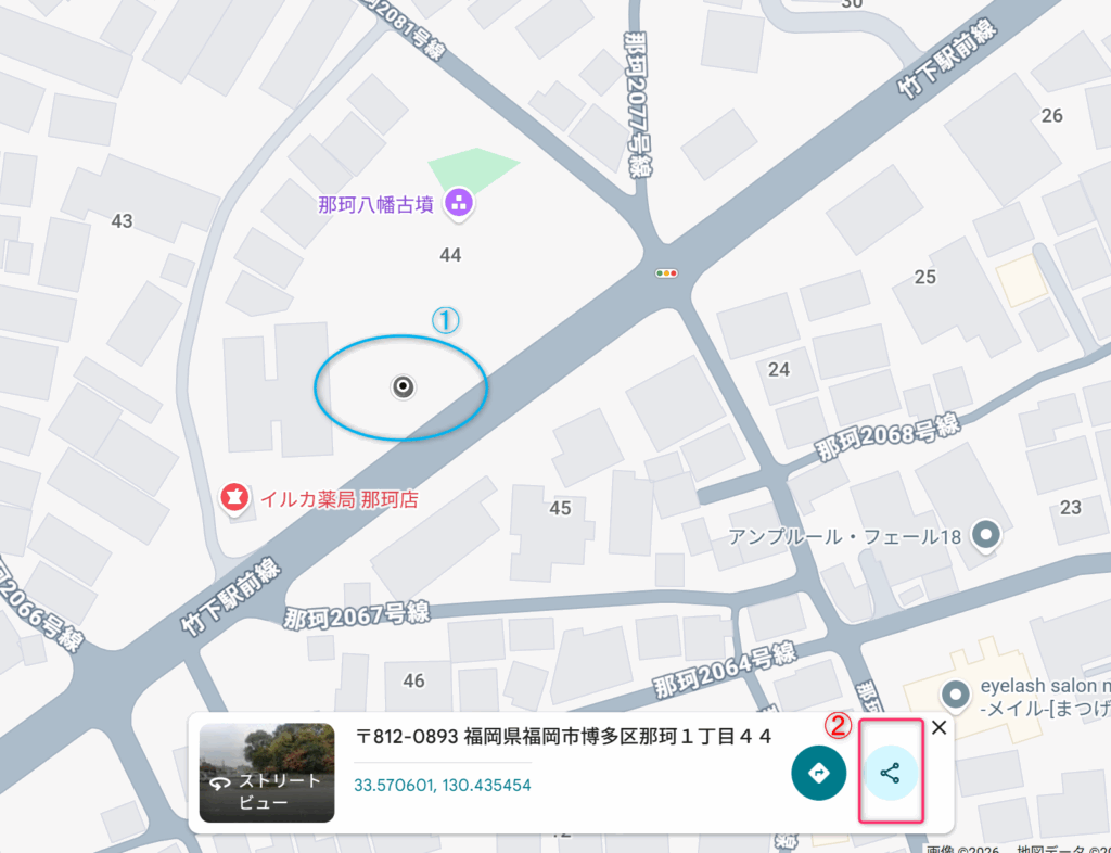 • クリックした場所の住所が特定ができたときには赤いピンが立つようです。