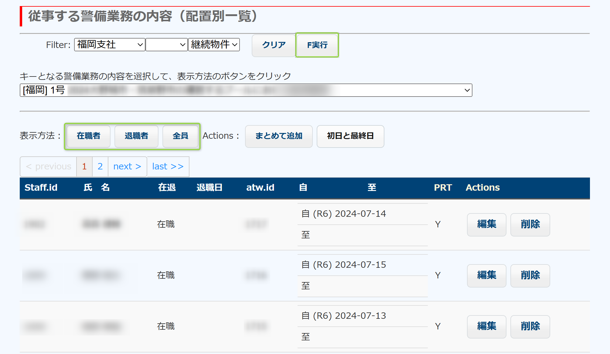 初日と最終日ボタンで、配置データを検索して初日と最終日を表示し、マウスクリックだけでそれらを反映させることができます。また、配置されているにも関わらず、当該「警備業務の内容」のデータが作られていない警備員を表示し、さらに初日と最終日が間違って登録されているデータは色を変えて表示します。表示されたデータはマウスクリックだけで変更することができます。