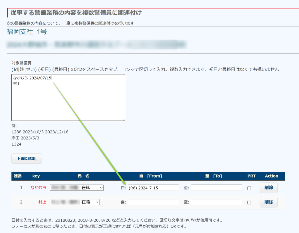 警備員に対して従事する警備業務の内容を登録するときは、一人ひとりの警備員にアクセスして、「従事する警備業務の内容」を一つ一つ登録していくのが通例です。が、本システムでは、警備業務の内容を選択し、それを使用しているデータを呼び出して表示・追加・日時修正を行うことができます。