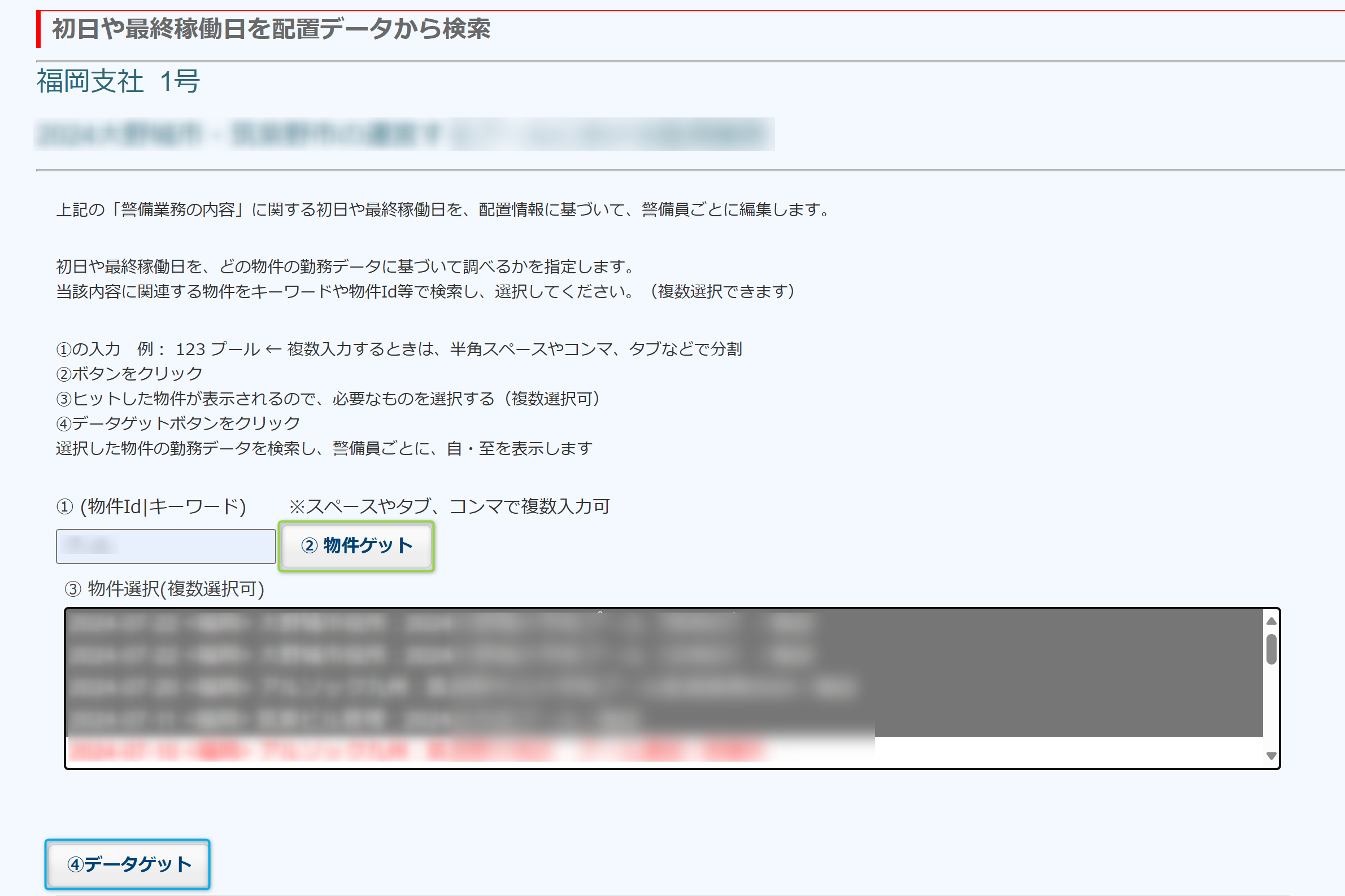 - 当該「警備業務の内容」に関連する物件を検索します。キーワードを何か入力して物件ゲットをクリックします。