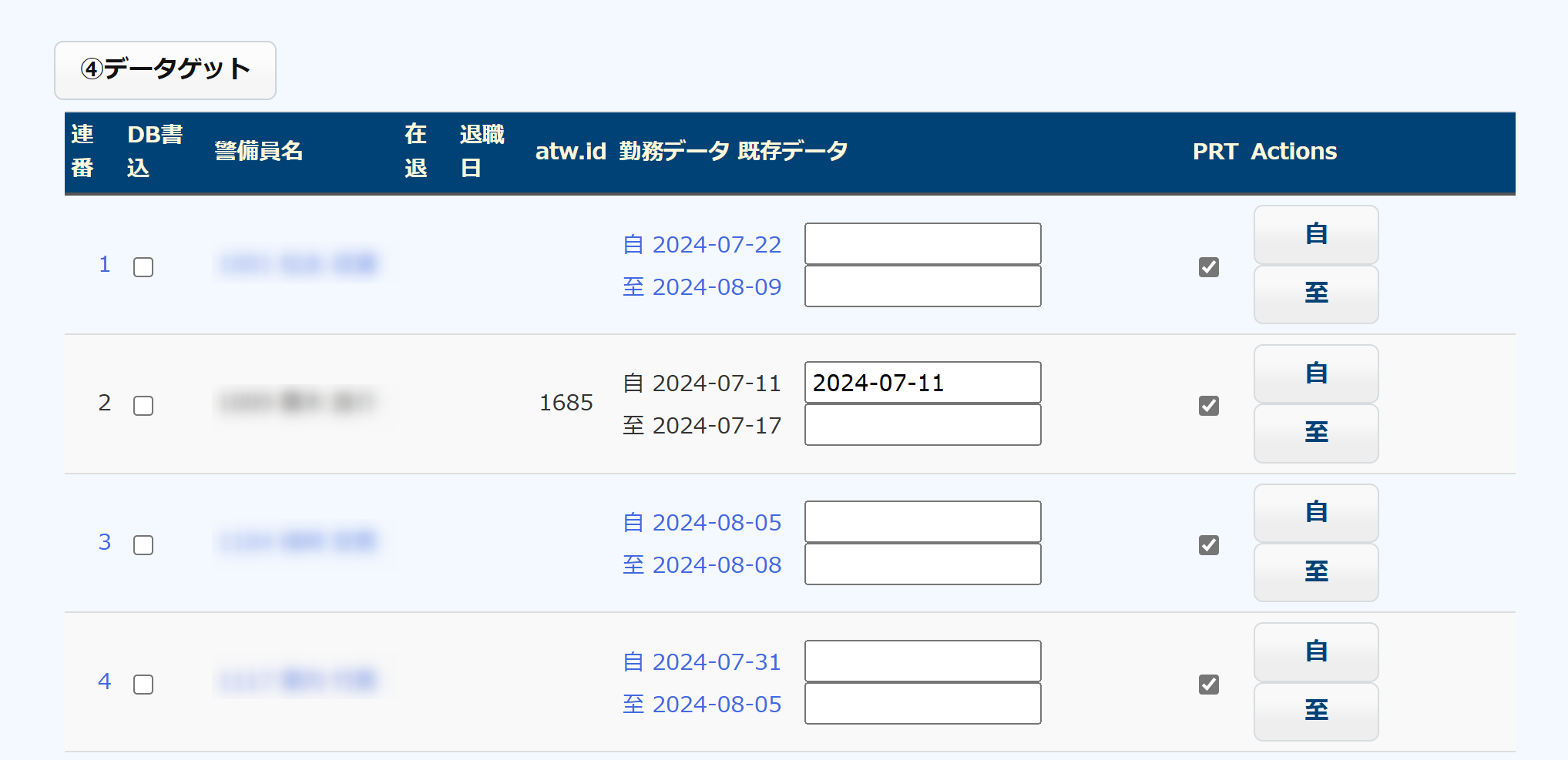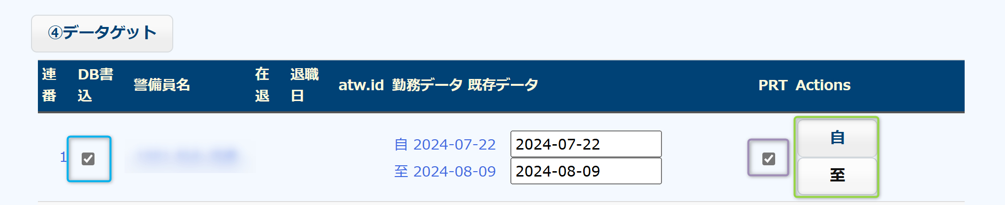 - 右から2番目のチェックボックス(PRT)は、警備員名簿をPDFに出力したとき、至をPDFに出力するかどうかのフラグです。