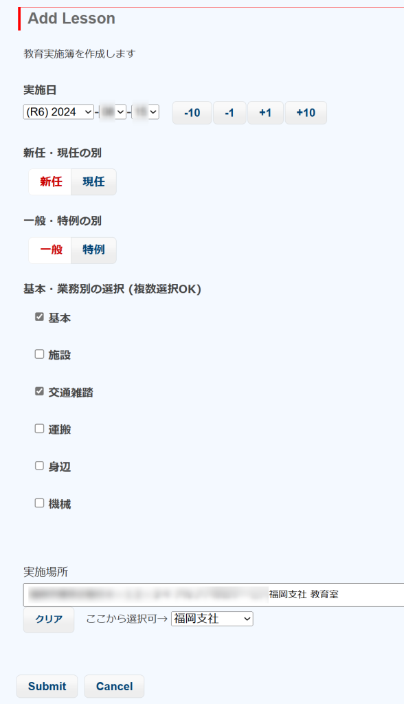 図の教育種別で、新たに「基本」にチェックを入れてSubmitすると、実施簿の編集を行うとき、教育事項の選択肢に基本教育の(基イ、基ロ、…)が出現するようになります。