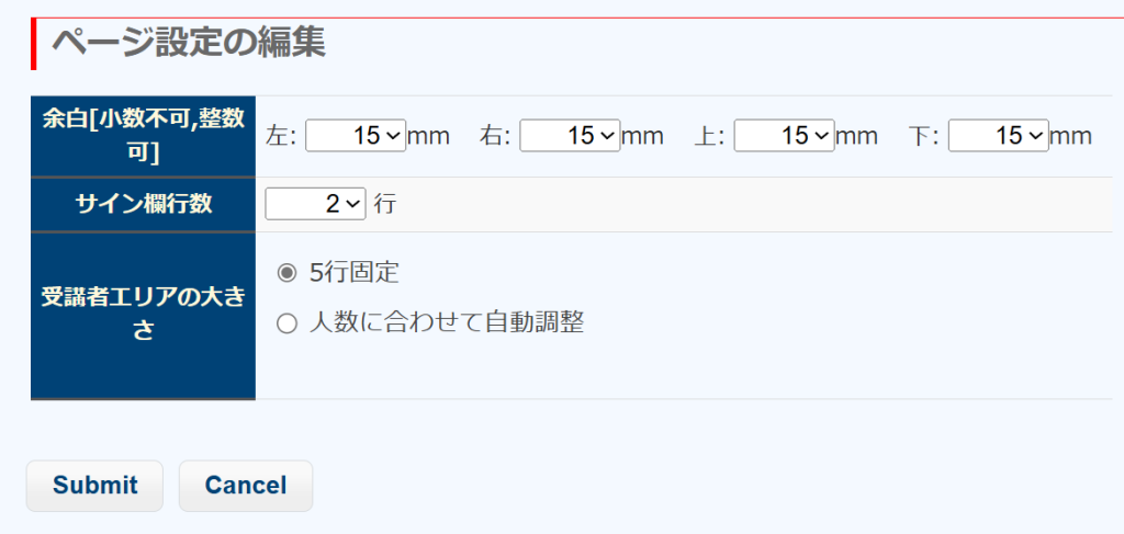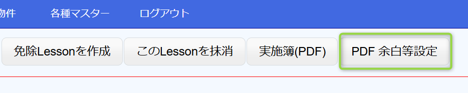 教育の内容が大きすぎて、教育実施簿が1ページに収まらない場合は、Lesson View のローカルナビにある「PDF余白設定」ボタンをクリックします。