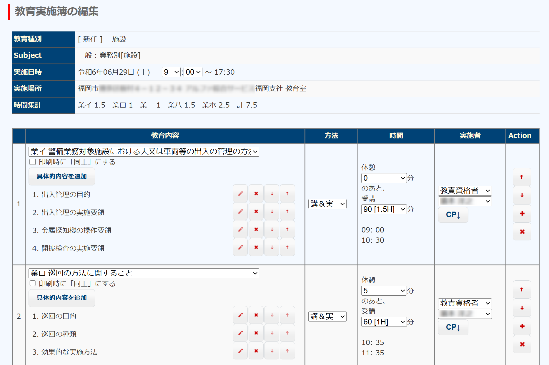 次の図は、新任教育の施設業務別教育の内容を登録している画面です。この内容が教育実施簿になります。