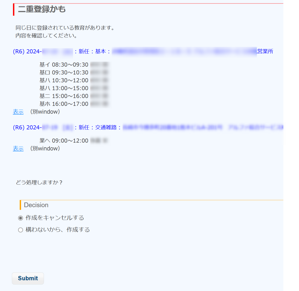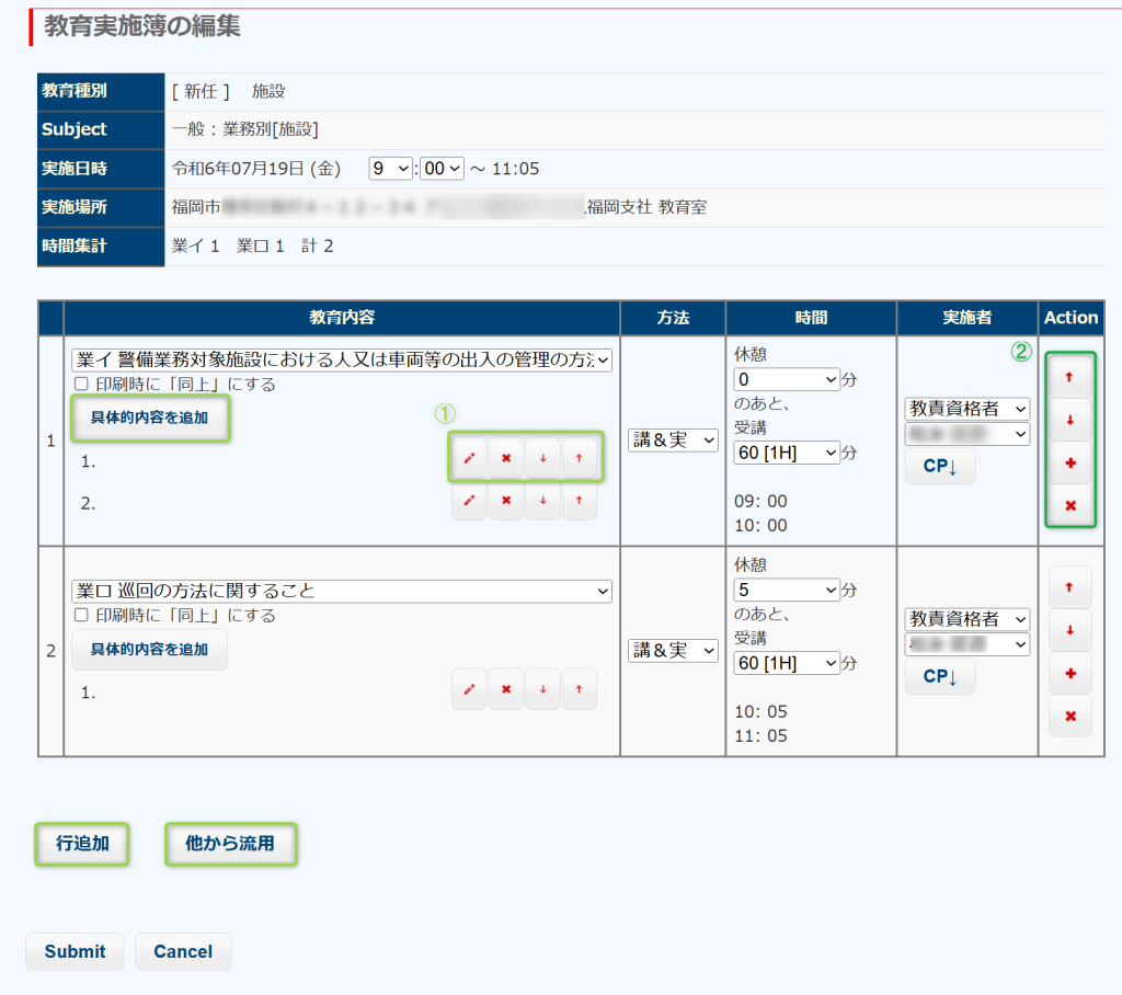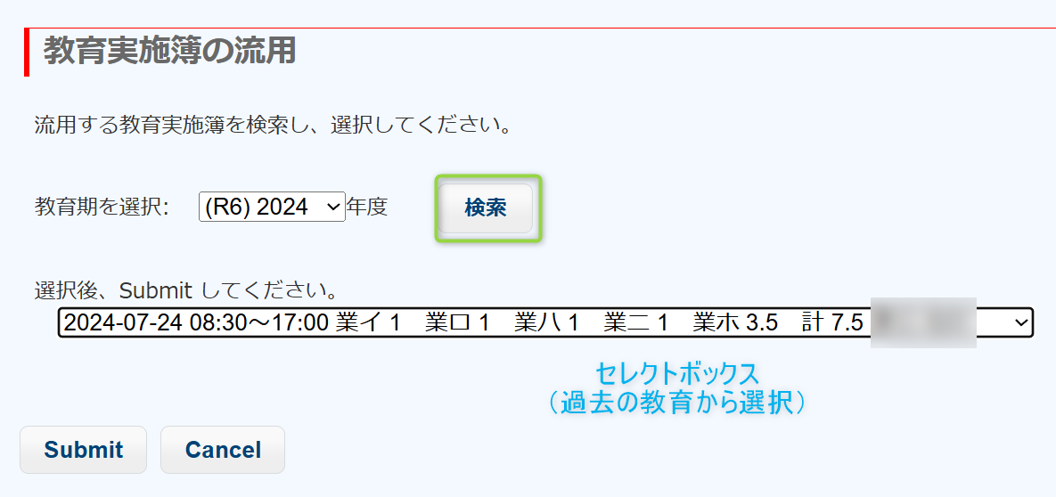 流用する教育を選んで、Submit すると、選択した教育が流用されます。実施者など適切に書き換えてSubmitします。