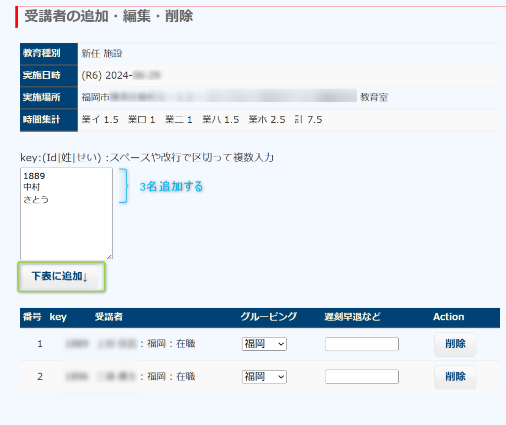 受講者を3名追加する場合は、図のように3名の警備員id か、姓、または姓のふりがなを記入して、「下表に追加」ボタンをクリックします。
