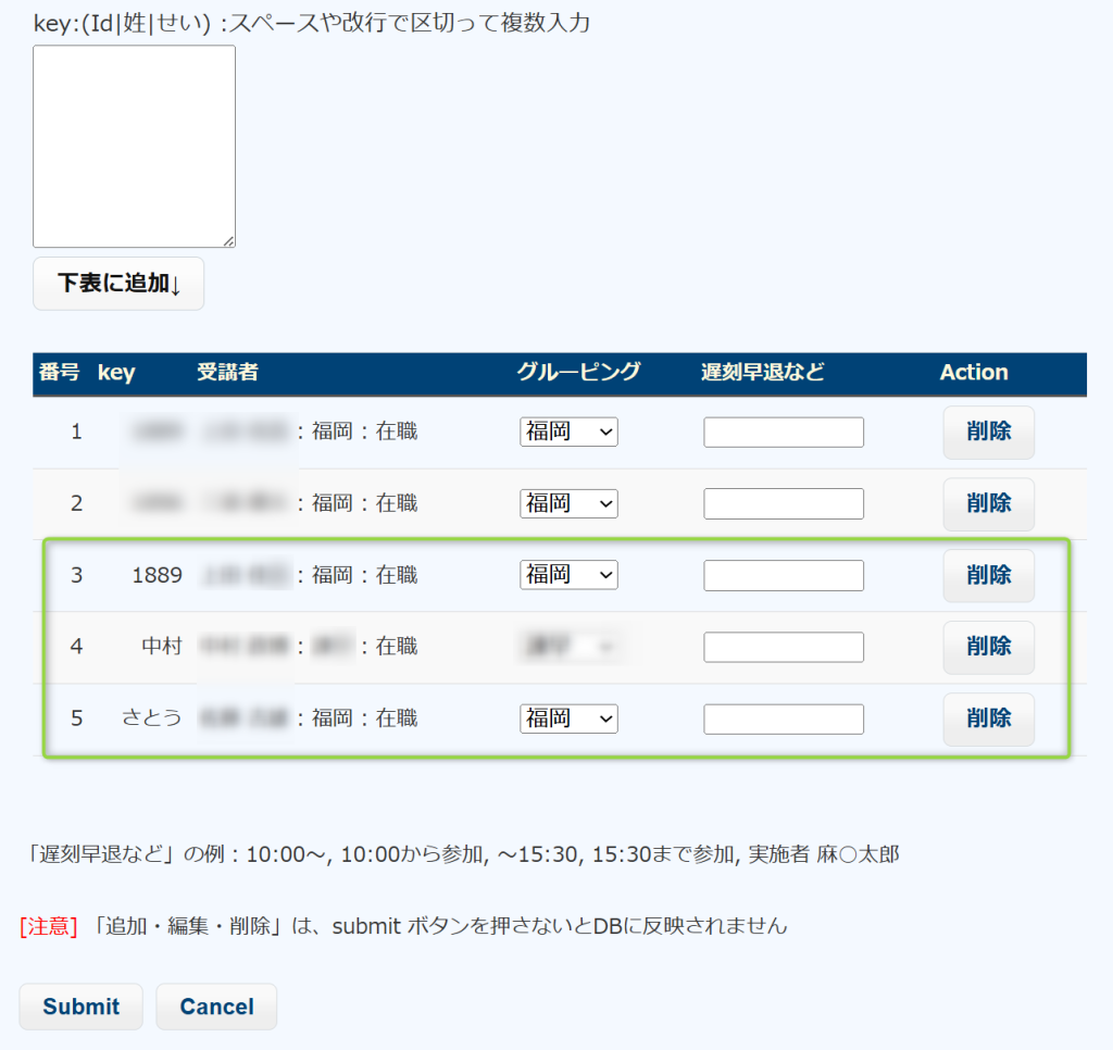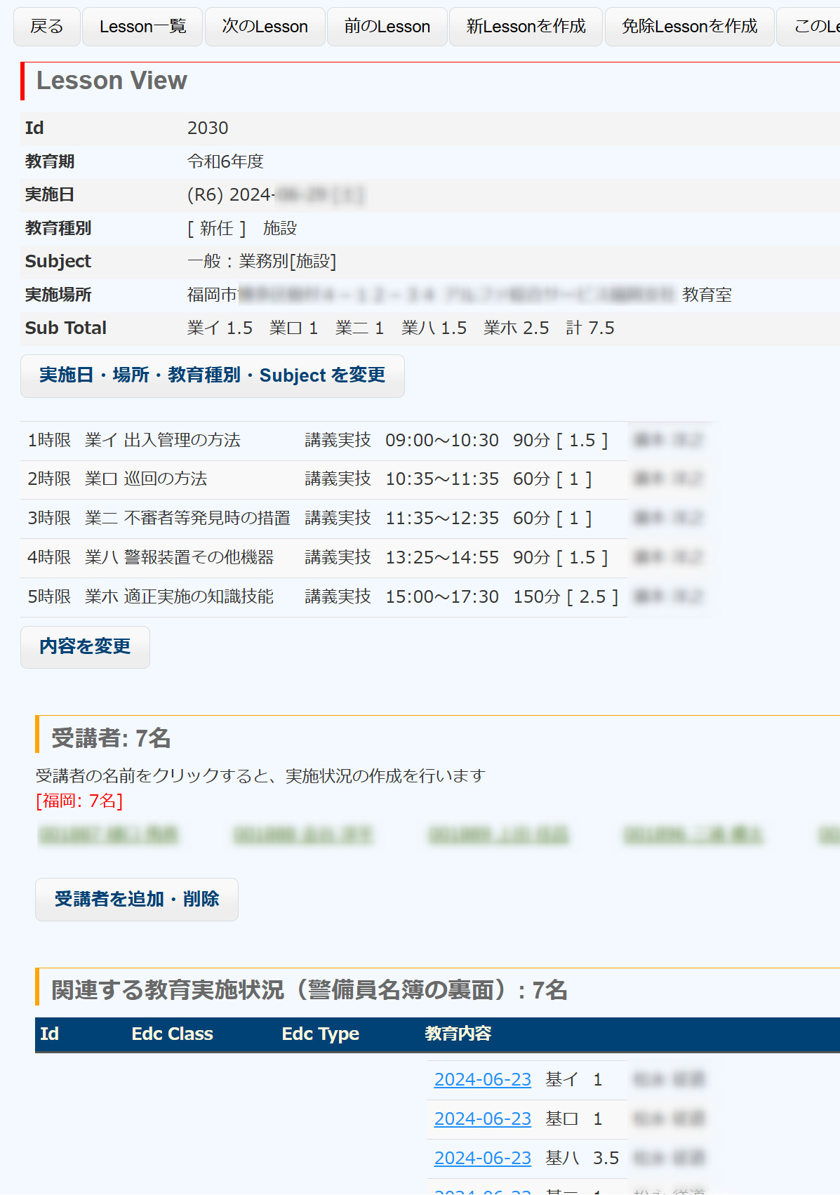 Submitすると、古い受講者のデータは消去され、現在の受講者表に掲載されている警備員(上の例では5名)が新たに登録されます。