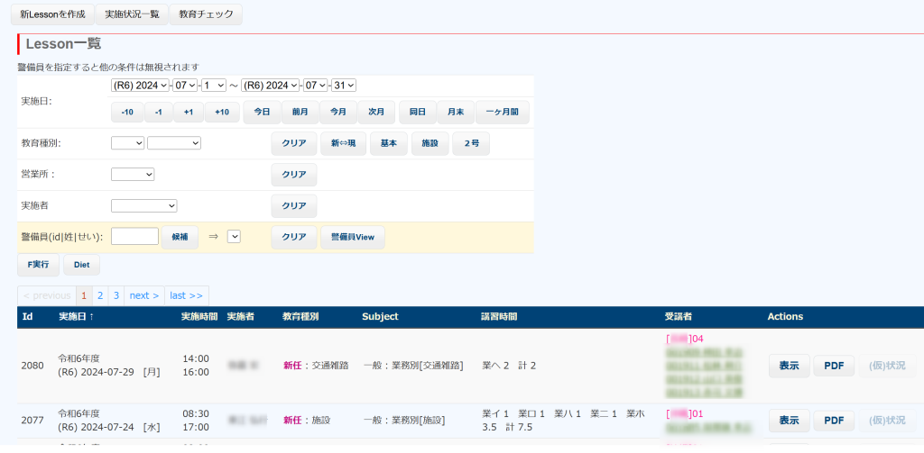 実施した教育を、当システムでは Lesson と呼称しています。Lesson一覧は、作成済の Lessonデータを一覧で表示します。