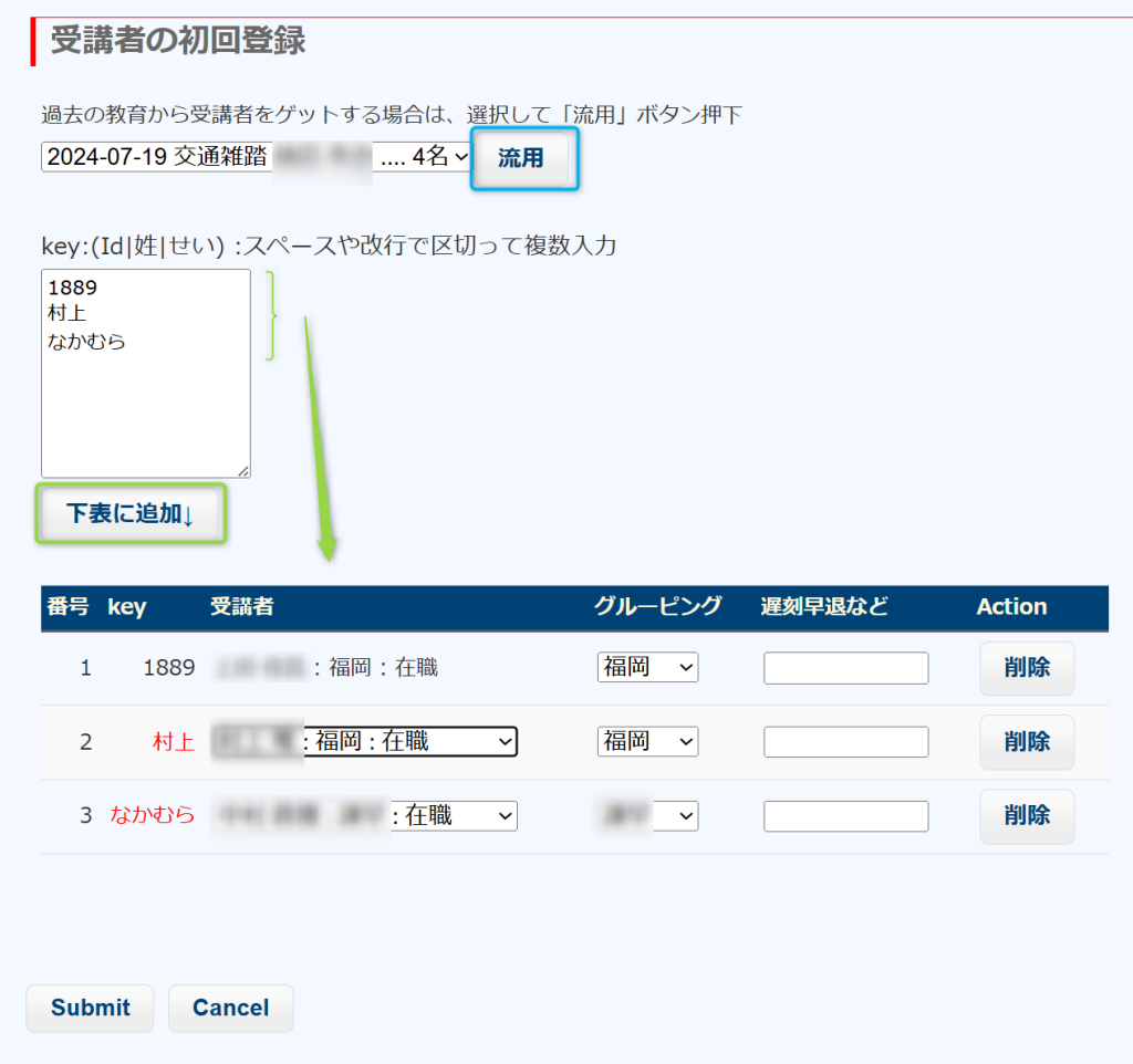 過去のLessonの受講者が一番上のセレクトボックスにセットされています(2週間前まで検索します)ので「流用」ボタンを押すことで彼らを受講者表に移すことができます。