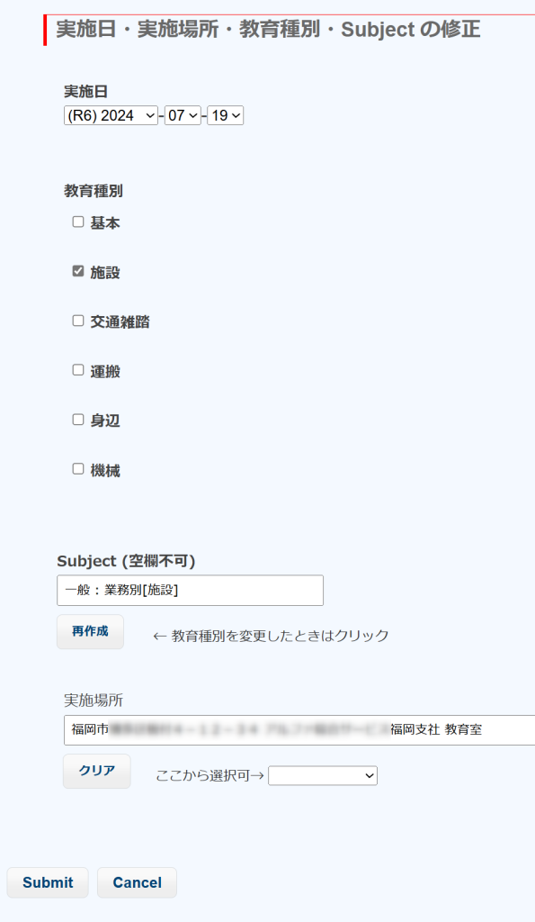 実施日・場所・教育種別・Subjectを変更