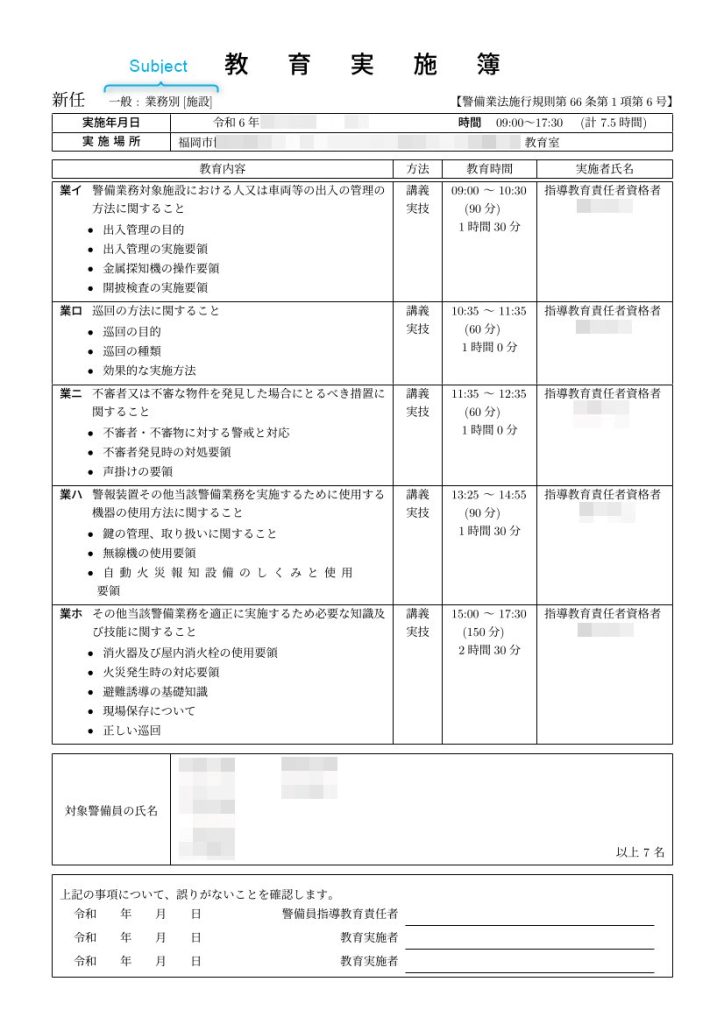警備業法施行規則では、基本教育や業務別教育のイ、ロ、ハ のことを教育事項と呼称していますので、ここでもそのように呼びます。また、教育実施簿に記載する具体的内容については、教育項目と呼称することにします。