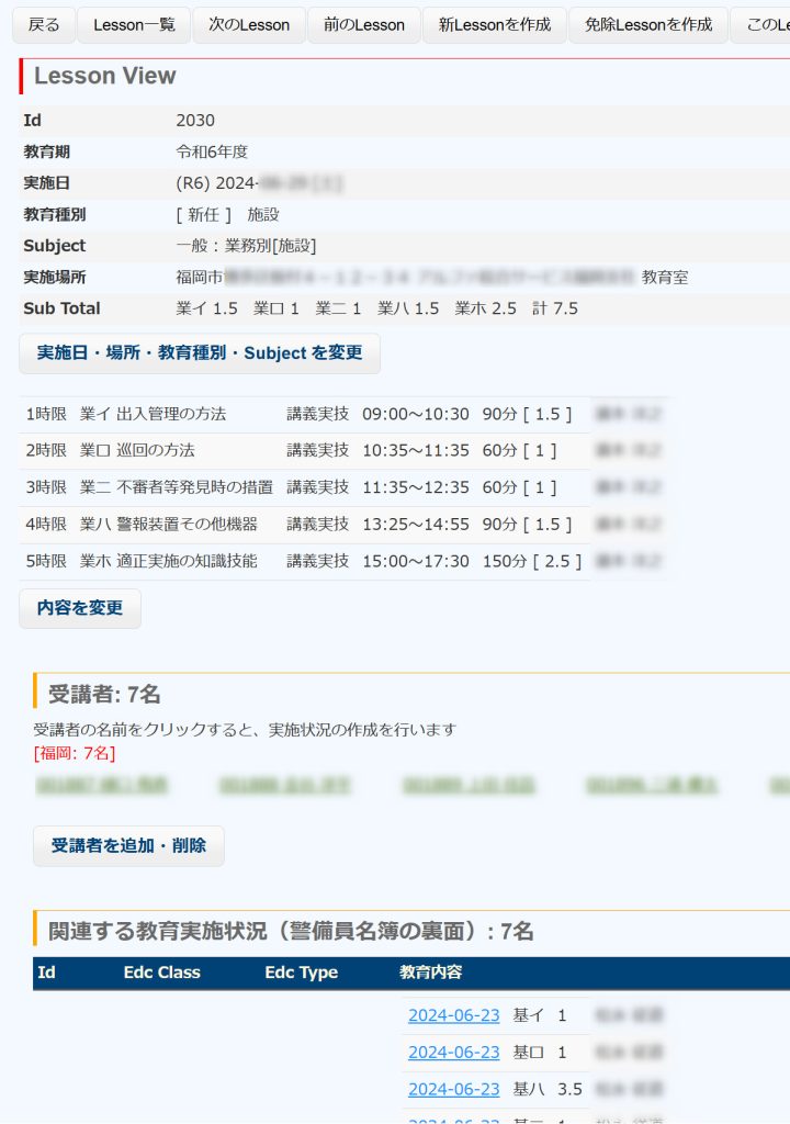 「表示」ボタンで Lesson View (当該Lessonの詳細)が表示され、内容の修正ができます。