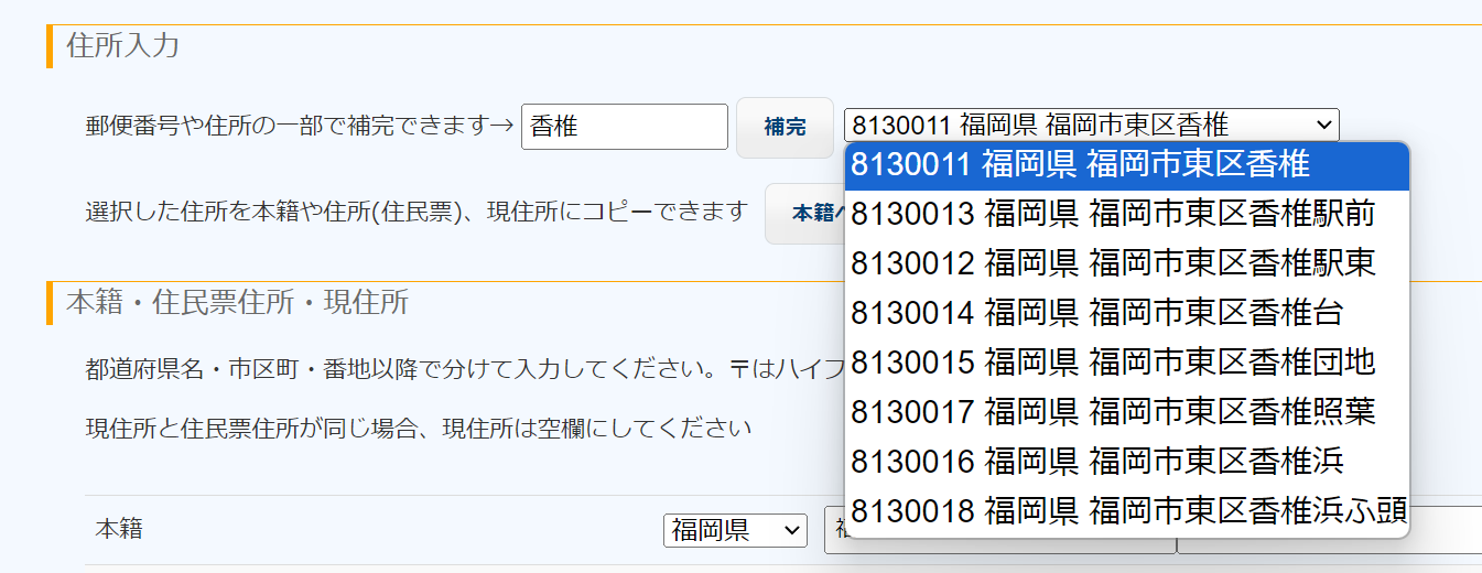 該当する住所を選択して、本籍へ、住民票へ、現住所へ の各ボタンをクリックすれば、指定箇所にその住所が反映されますので、番地以降の部分だけ追記してください。