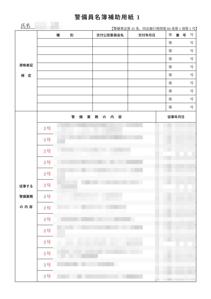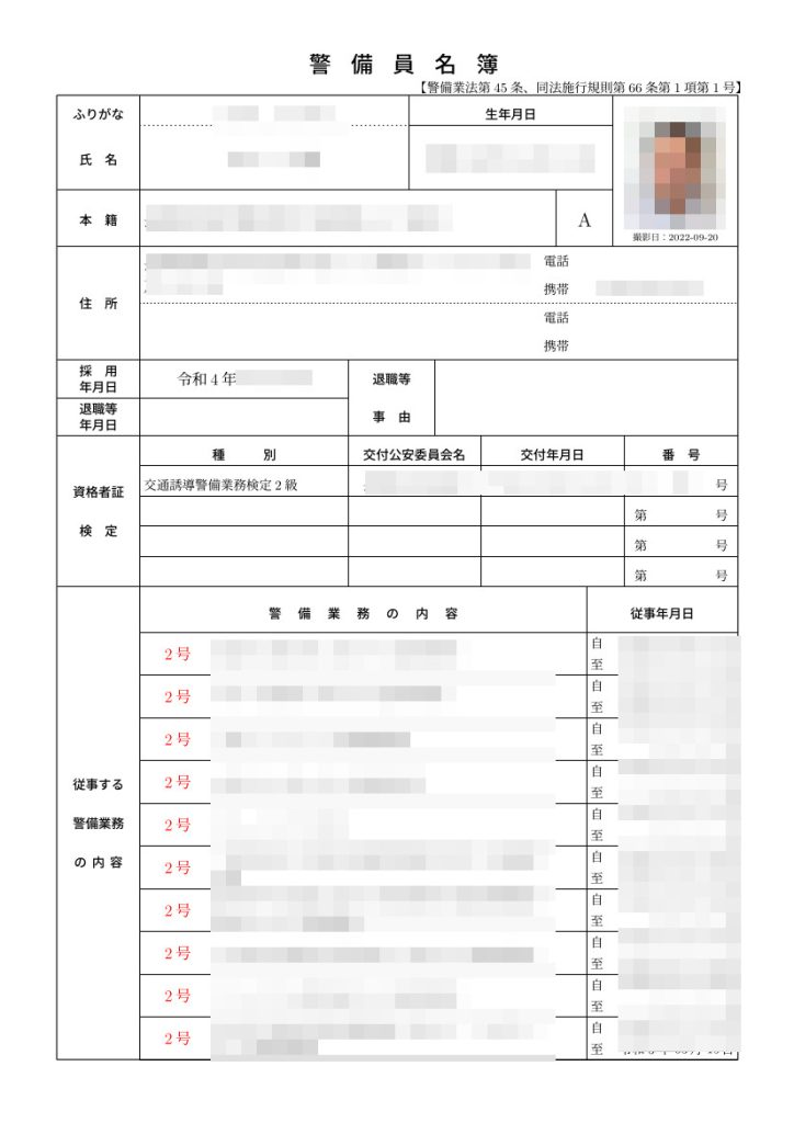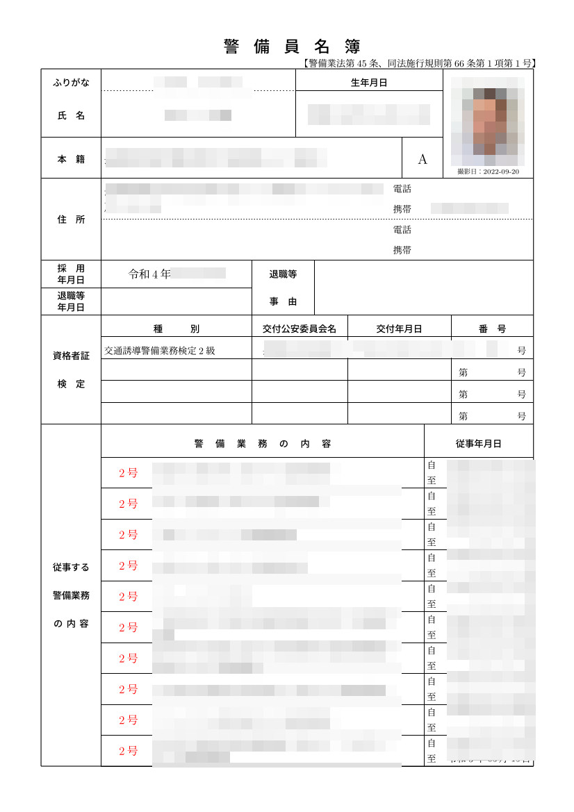 以下は、警備業法に定めがあるものではありませんので、警備員名簿等に出力されることはありません。