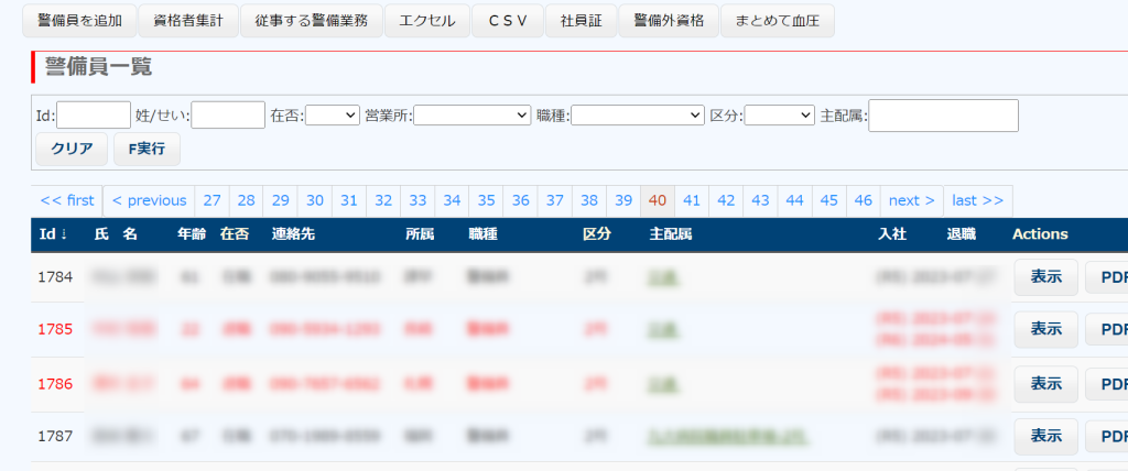 登録された警備員を一覧表示します。在籍者は黒で、退職者は赤で表示されます。