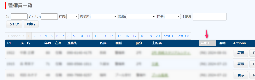 フィルター機能とソート機能は、警備員一覧だけではなく、他の多くの一覧表示のときも使えます。