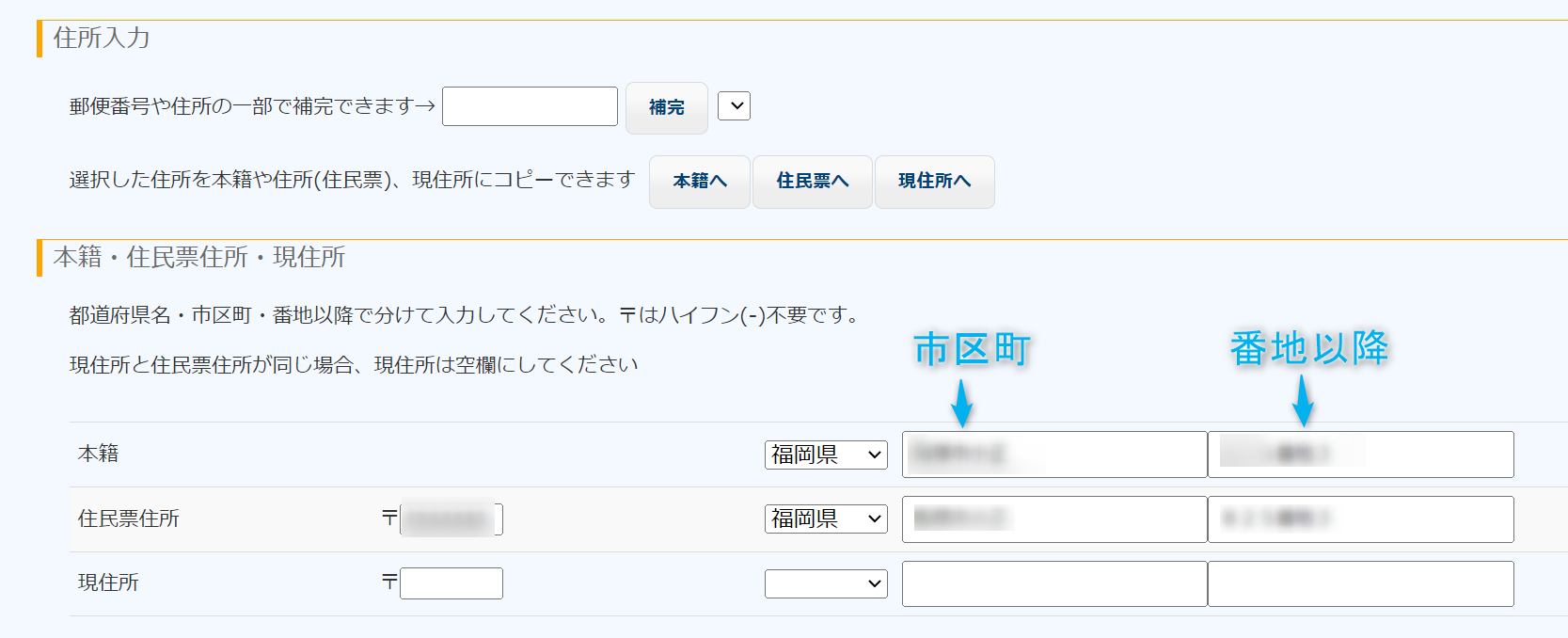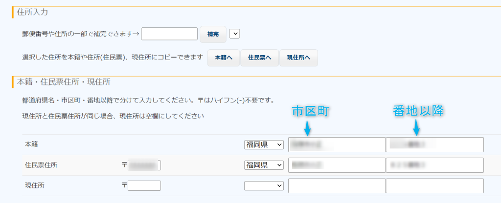 - 現住所が住民票住所と同じであれば、現住所は入力しない