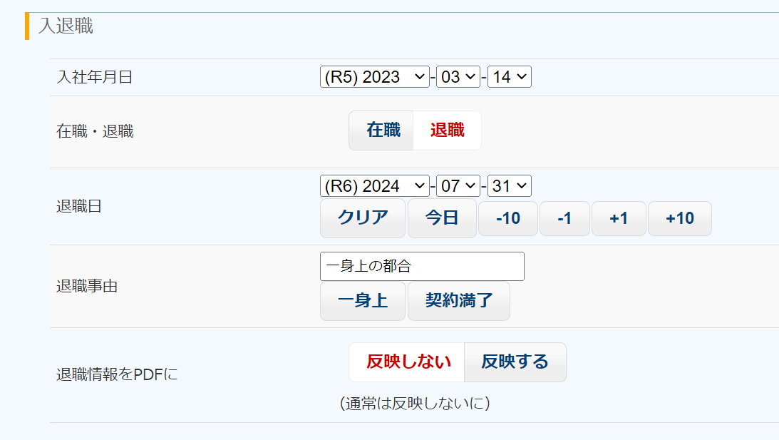 「退職情報をPDFに」を、「反映しない」にすると、退職日や退職事由を入力していたとしても、警備員名簿をPDF出力したときに、それらが空欄になります。