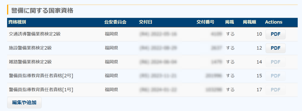 警備業務に関する資格を追加したり、編集するには、「編集や追加」ボタンをクリックしてください。その警備員が所持する資格の一覧表示に遷移します。