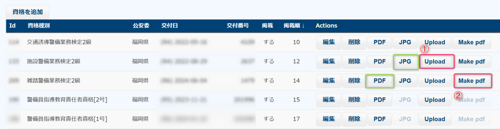 資格者証や合格証明書は、その画像をアップロードしておきましょう。①の「 Upload」ボタン を使ってください。