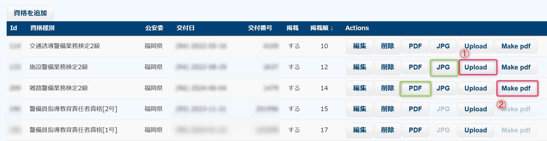 図は、資格を一覧表示する画面です。この画面から、資格の追加・編集ができます。