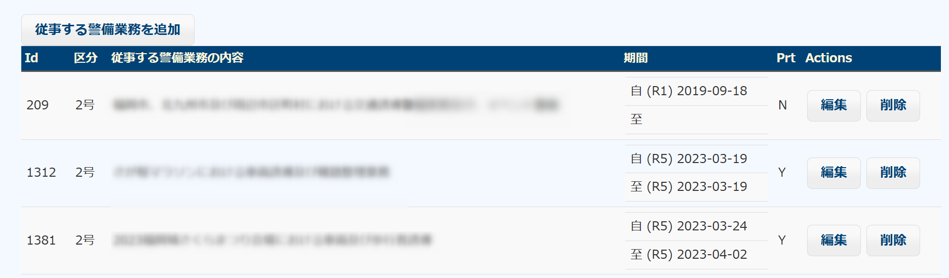 警備員ごとに、従事する警備業務の内容を登録します。下図の左下にある「編集や追加」ボタンで追加や編集ができます。