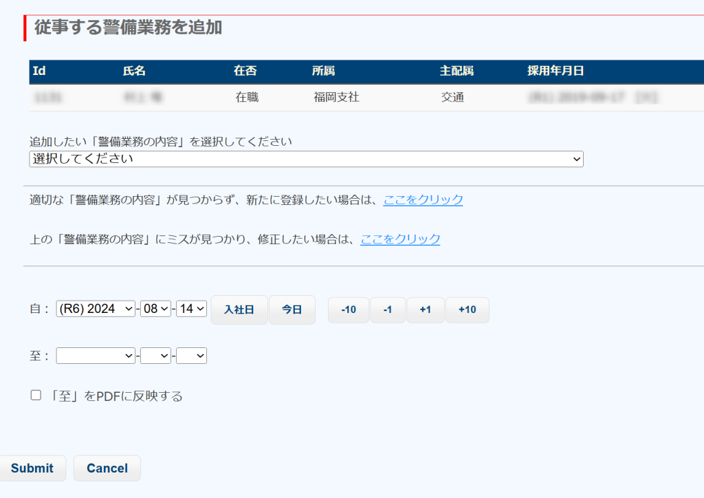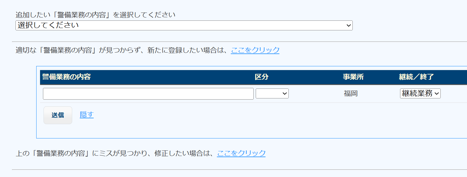 下図の青枠で囲まれた部分が出現し、記入後、送信ボタンで新たに警備業務の内容を登録できます。