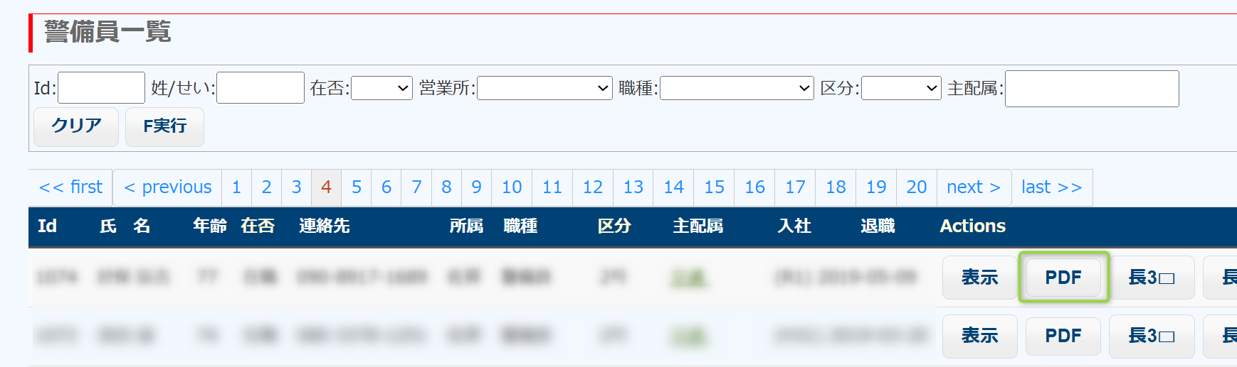 [グローバルナビ:警備員] > PDF または [グローバルナビ:警備員] > 表示(警備員View)> 警備員名簿 (PDF)