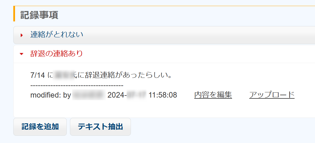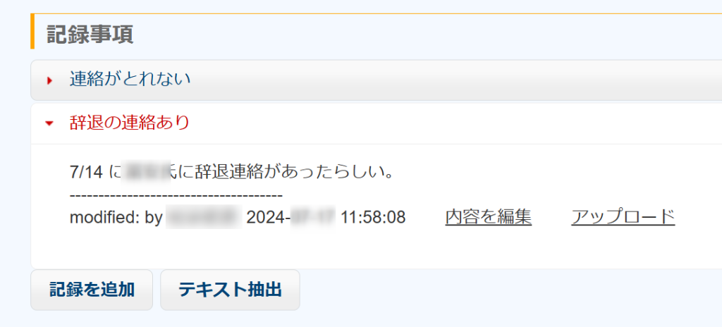この人物とは半月以上連絡が取れませんでした。しかし、当人が来年、或いは数年後に再度申し込んでくることも考えられます。そのとき採用担当者が別の社員に変わっていたら、この人のことを知らずに採用してしまうかもしれません。情報の共有はとても大事です。