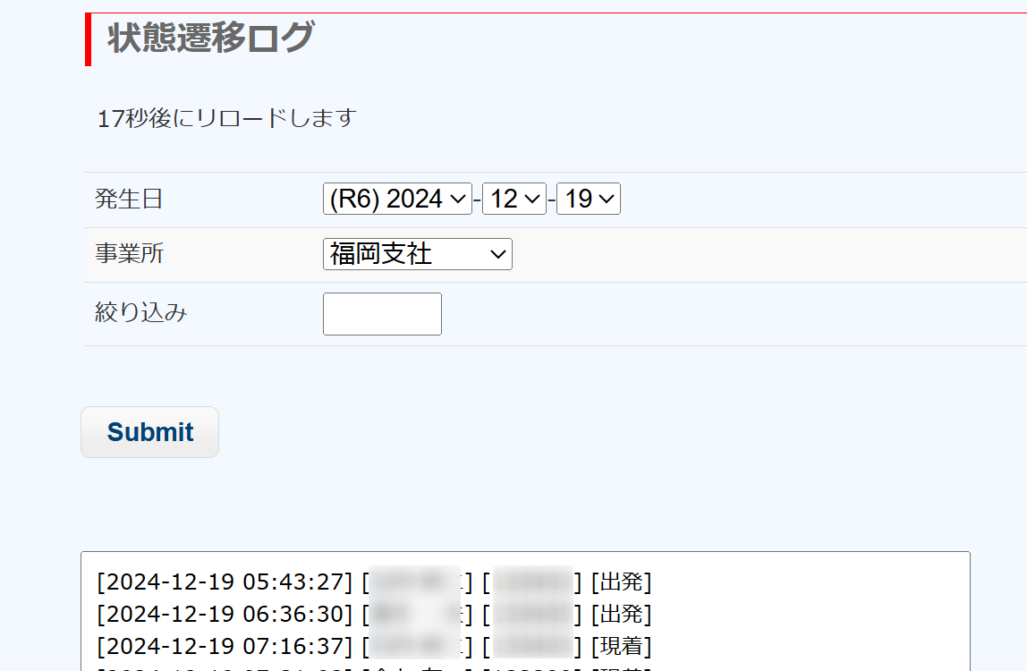 警備員が「出発」「現着」などをタップした情報はDBに記録されますが、同時にログファイルにも記録されますので、それを表示しておくと、現着(上番)チェックができます。