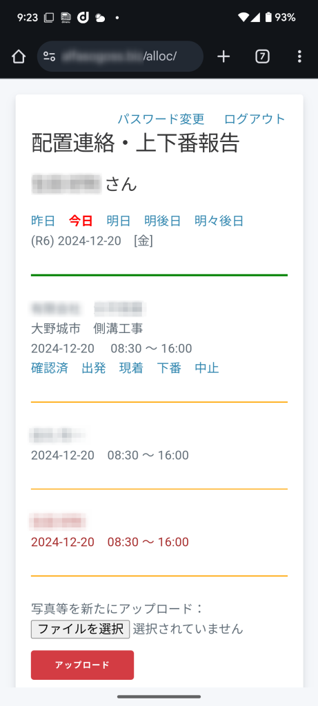 警備業管理システムで配置入力を行えば、対象警備員のスマホから上下番報告システムにアクセスすると、図のような画面が表示されます。